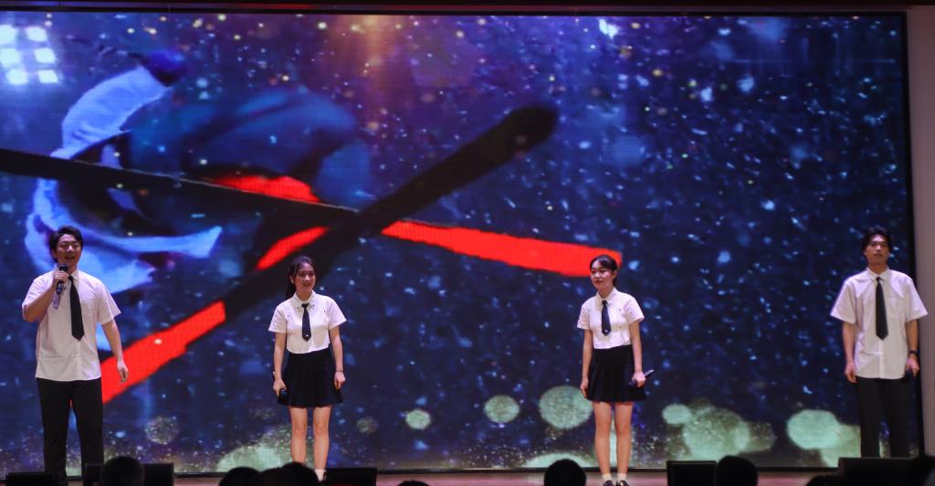 现场气氛热烈,由学校师生表演的《长江之歌》《一起向未来》《牺牲》《念奴娇·追思焦裕禄》等节目引发观众阵阵掌声,听歌识曲、集体拉歌等互动环节更是将整堂党课的氛围推向高潮。师生们在耳熟能详的红色音乐中启迪思想,汲取力量、感悟信仰。党课在大合唱《没有共产党就没有新中国》中缓缓落下帷幕。