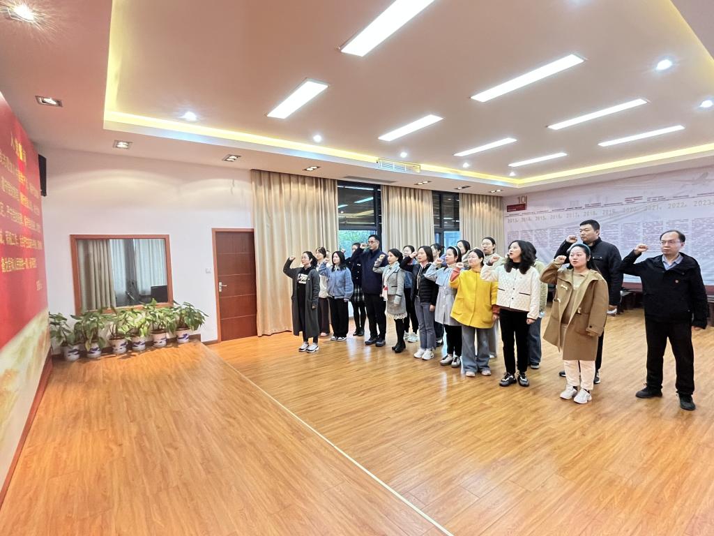 在峒山村的二楼会议室,思政课部全体党员重温了入党誓词。