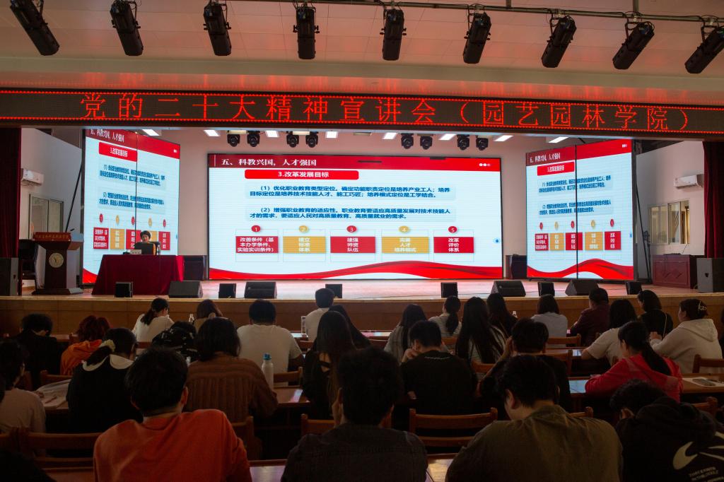 4月11日下午,学校党委委员、副校长杨艳芳为园艺园林学院在校学生作“学习贯彻党的二十大精神”宣讲报告。报告会在学校大学生活动中心举行,学院党支部支委成员、全体辅导员、班主任出席报告会,报告会由园艺园林学院党支部书记南佑平主持。