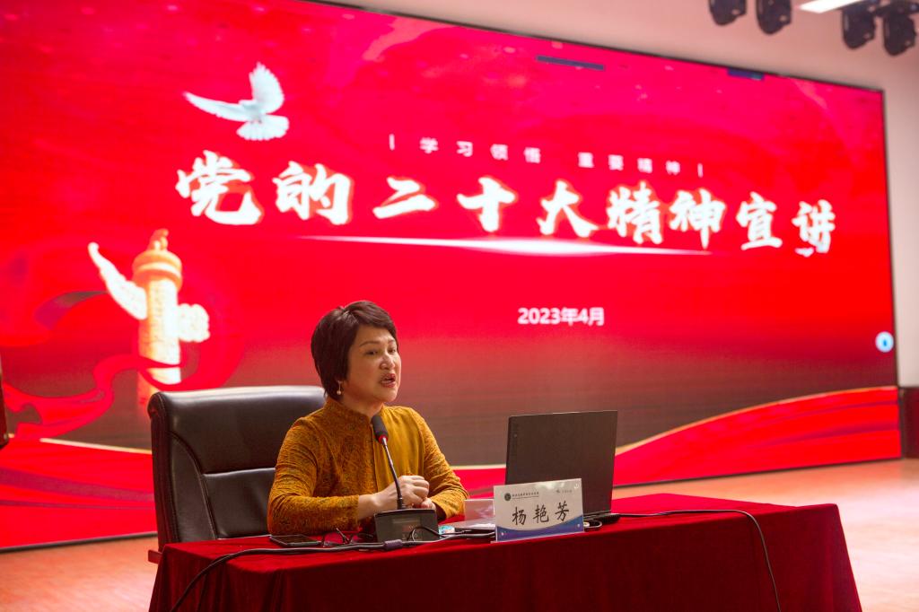 杨艳芳分别从党的二十大概况、大会主题、新时代10年的伟大成就、中国式现代化、科教兴国、人才强国等六个方面逐一作了宣讲和深刻阐释。最后她告诫学生一要坚定理想信念,扣好人生第一颗扣子;二要练就过硬本领,为新时代新起航蓄力储能;三要增强综合素质,在新时代放飞青春梦想。