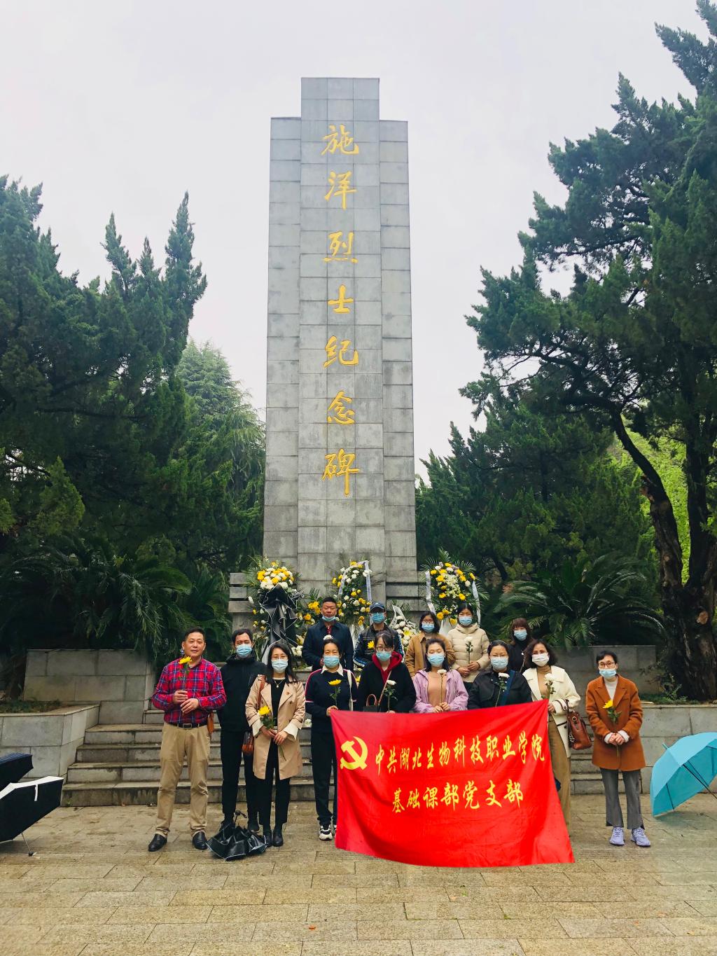 3月31日,临近清明,细雨纷纷。为传承革命英烈精神,将英雄精神、红色基因传承下去,激发党员和教师们的革命斗志,基础课部党支部前往施洋烈士陵园,开展“缅怀革命先烈”主题党日活动,当日下午无课的党员教师们参加了此次活动。