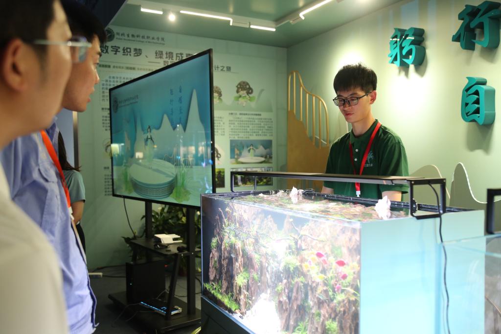 经过4天现场的搭建、调试等准备工作,学校在开幕式的展出现场效果震撼,得到了各级领导的驻足关注及观众的广泛好评并吸引了多家媒体采访,现场参会人员纷纷体验、合影。