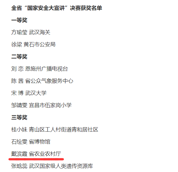 4月13日,湖北省国家安全大宣讲决赛在汉举行。一个半小时的比赛里,10名优秀宣讲者围绕政治安全、粮食安全、生态安全、生物安全、社会安全、科技安全、文化安全等,讲述各行各业深入贯彻总体国家安全观的生动实践。经过激励角逐,我校教师戴滨霞在湖北省国家安全大宣讲决赛中荣获三等奖。