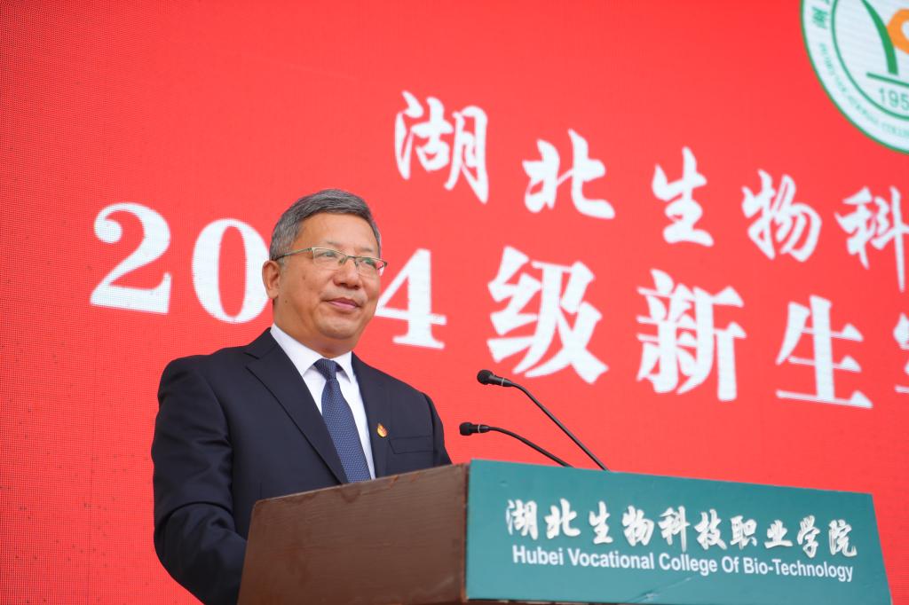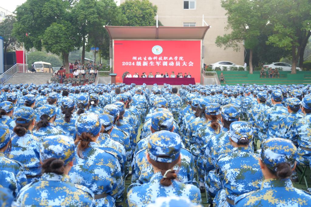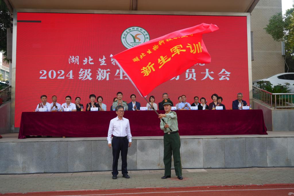 大会宣读了《湖北生物科技职业学院关于组建2024级新生军训团的决定》,校党委书记田曙曦向军训团授予军训团旗。