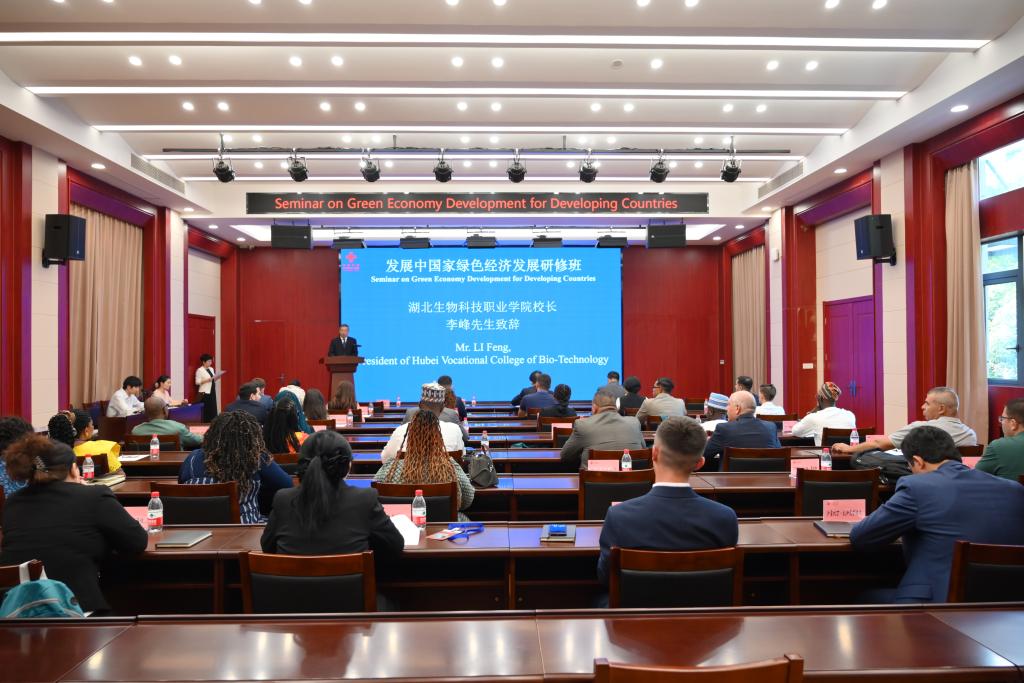 李峰代表学校致辞。他表示,湖北生物科技职业学院是全国最早承办发展中国家间技术合作项目的单位之一,是湖北省唯一具备援外培训资质的高职院校。我们将充分利用自身优势,根据发展中国家绿色经济发展的实际需求,精心设计课程内容,竭诚为学员打造优质的学习平台,创造良好的学习环境。