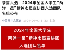 日前,团中央青年志愿者行动指导中心联合各相关单位开展遴选大学生志愿宣讲团进行2024年全国大学生井冈山精神志愿宣讲活动、延安精神志愿宣讲活动和“两弹一星”精神志愿宣讲活动的结果公布。经过层层遴选,学校动物(食品)科技学院“阳光自励团”志愿宣讲团成功入选上述三项志愿宣讲团。