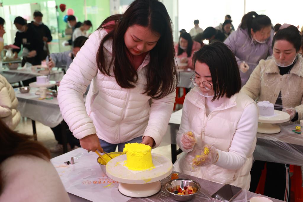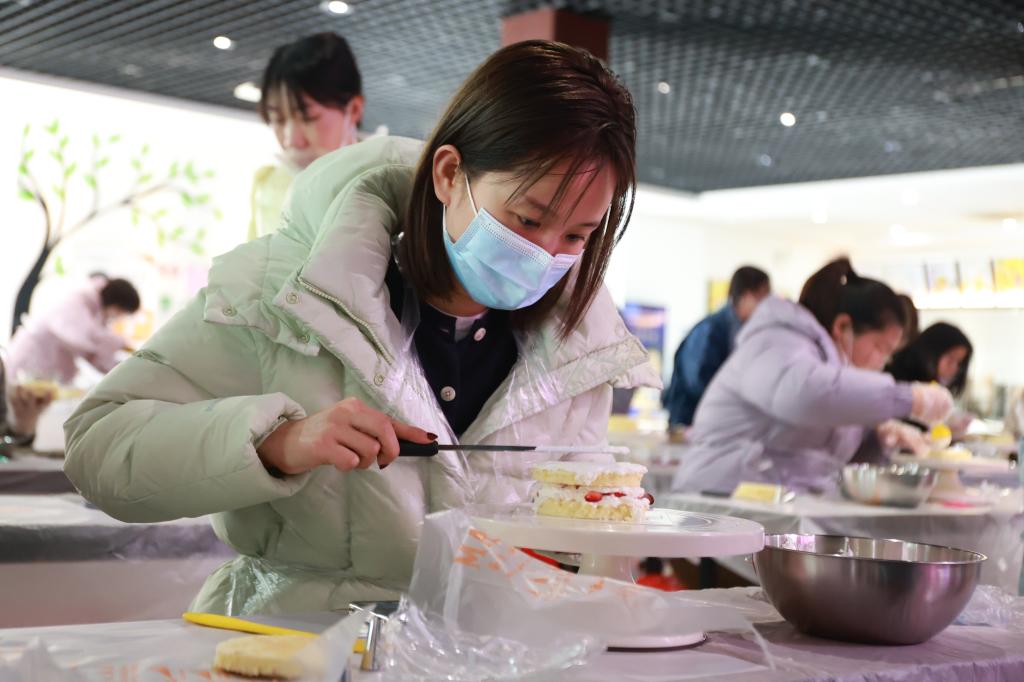 “来看看我的做的蛋糕,好看吧?”3月7日下午,校工会、校妇委会联合动科学院焙小兜DIY烘焙店开展“三八妇女节”活动。约40名女教职工参与,每名职工将DIY一份4寸的水果蛋糕。