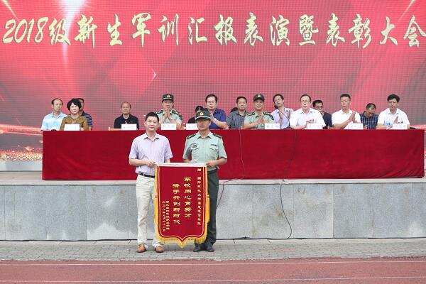 军训汇报表演结束后,党委委员、纪委书记周天明宣读了《湖北生物科技职业学院关于表彰2018级学生军训先进集体和先进个人的决定》,辅导员胡广京、王智欲、刘腾飞、周丽娟和姜智慧被评为优秀指导员;党委委员、副校长曾开红向承训部队赠送了锦旗。