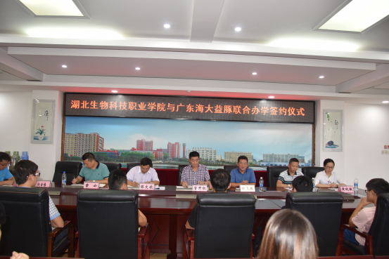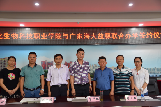 9月18日下午,我校与广东海大集团益豚养殖事业部在学校一号教学楼206会议室隆重举行“海大益豚班”签字仪式。出席本次签字仪式的校企双方领导有:湖北生物科技职业学院党委委员、副校长曾开红、动物(食品)科技学院院长陈文钦博士、副院长曹云、广东海大集团益豚养殖事业部湘北区总经理郑飞燕、广东海大集团益豚事业部人力资源总监黄昌军、广东海大集团益豚事业部人力资源经理黄晓敏等。动物科技学院教研室主任向金梅博士、动物科技学院“益豚班”班主任刘腾飞以及50多名学生代表也一同见证签字仪式。会议由动物(食品)科技学院副院长曹云主持。