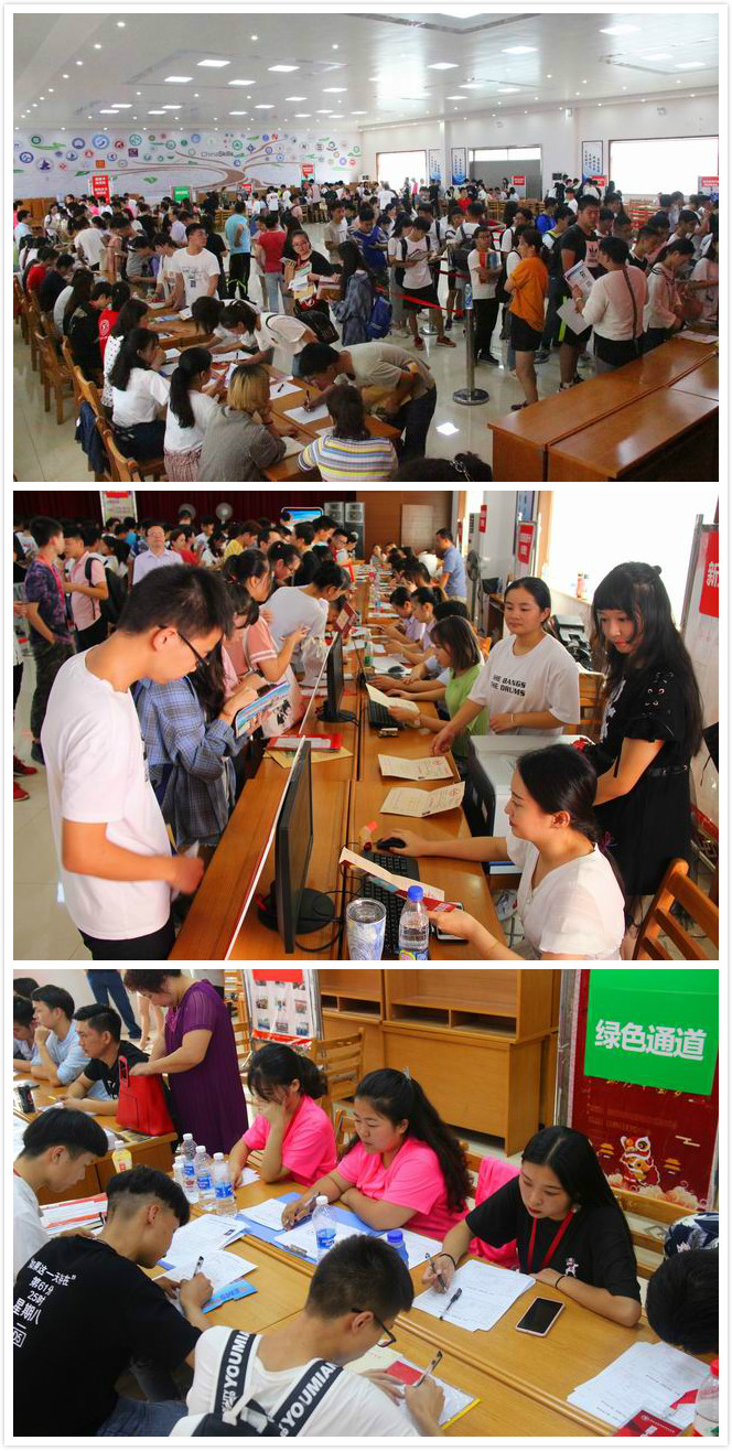 新生们在大学生活动中心有序排队等待入场办理入学手续。进入大学生活动中心后,学生在引导员的引导下,依次完成入学报道,学费、住宿费缴纳,大学生平安保险缴纳,宿舍安排,饭卡、热水卡办理等手续。同时,学校还开设了绿色通道,为家境贫困的学生办理生源地贷款和学费迟缴等手续。办完手续后,在紧邻大学生活动中心的操场上,每个学院都设置了新生接待处,新生可以在学长学姐的带领下前往宿舍安顿休息。1号教学楼的一楼大厅,依次排开设置了各学院的专业咨询处,在这里,新生可以及时了解自己所录取专业的学习课程、就业方向以及专升本等相关信息。