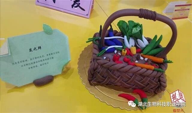 王琦认为西点的手工化和绿色化是未来的发展方向,在今年第八届全国职业院校在校生创意西点技术大赛上,王琦获奖的创意西点“蔬之鲜”,遵循的也是“绿色”二字。楚天都市报记者看到,“蔬之鲜”是一个造型为蔬果篮子的翻糖纯手工蛋糕,篮子里的胡萝卜、黄瓜等蔬菜,均是手工捏制。