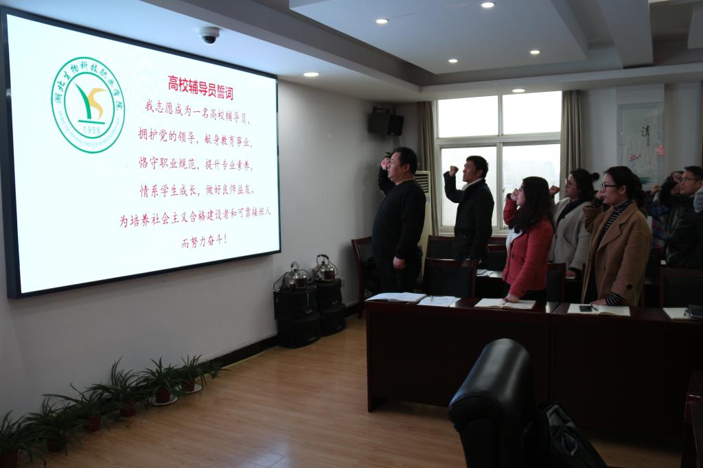 会议第二阶段为布置期初学生工作。余杰带领全体辅导员重温高校辅导员誓词,随后布置期初工作以及三月份重点工作。主要内容包括:党团建设,安全稳定(统计学生情返校况,签订学生安全责任书和告知书,关于加强春季流感及传染病防控预警工作通知,食品安全隐患,心理健康教育等),学风建设,校园文化活动,辅导员职业能力提升,“一院一品”工程,制度建设(突发事件应急处理预案和心理危机干预应急预案),奖资助工作,易班建设和直饮水卡发放等。