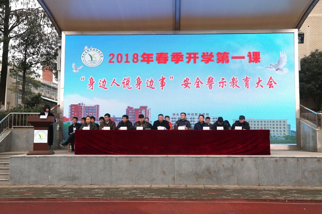 为增强学生安全防范意识,确保校园安全稳定,3月5日中午,学校在西苑田径场召开了2018年春季开学第一课——“身边人说身边事”安全警示教育大会。校党委委员、副校长周元才出席,学工处、保卫处、后勤处、各二级学院负责人,全体辅导员以及全校4000余名学生参加了此次会议。会议由学工处处长余杰主持。