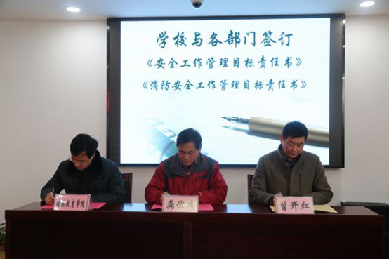 会上,学校校长龚伏廷与各分管校领导、各部门负责人签订了《2018年安全工作管理目标责任书》和《2018年消防安全工作管理目标责任书》。