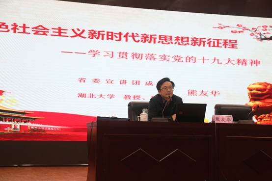 报告会上,熊友华教授以《中国特色社会主义新时代新思想新征程》为题,从党的十九大的基本情况、中国特色社会主义新时代、中国特色社会主义新思想、中国特色社会主义新征程四个方面,对党的十九大精神进行了系统、全面、深入的讲解。