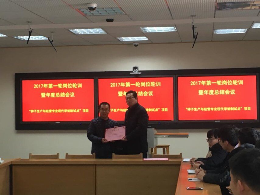 主持人首先介绍了16级种子生产与经营专业学生学徒制第一轮岗位轮训的基本情况。园艺园林学院院长南佑平阐述了学徒制的重要意义,他表示这项工作要继续有力推进,并对各位企业师傅、领导对此项工作的大力支持表示衷心的感谢!然后,16级种子生产与经营专业学生马娜、李辰胤、曾凡森分别代表检测组、玉米组、水稻组进行了岗位轮训汇报。我校党委副书记鲁性贵为优秀带教师傅颁发荣誉证书。接着,种子生产与经营专业教研室主任王海萍做第一轮学徒制岗位轮训总结。随后,湖北省种子集团有限公司专家、带教师傅做阶段总结,对这轮实训中的优点、缺点、改进措施等与专业老师进行深入探讨。最后,学徒制试点工作项目负责人张云珍从项目建设目标、已完成建设内容及成效、遇到的问题及解决方法、对创新发展行动计划工作的具体建议四个方面进行年度总结。
