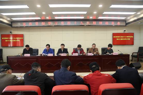 会上,党委副书记鲁性贵同志传达了党的十九大精神。校党委书记田曙曦同志对我校宣传贯彻学习党的十九大精神作出部署并提出四点意见:一是要充分认识到全面系统学习党的十九大精神的极端重要性,把思想和工作部署统一到中央的决定精神上来;二是把握学习要求,全面深入学习,准确把握十九大精神的精髓和核心要义;三是学习对象要做到全覆盖,要面向全体教职工,同时也要包括全体在校学生;四是要通过学习,用十九大精神推动学校各项工作的发展。
