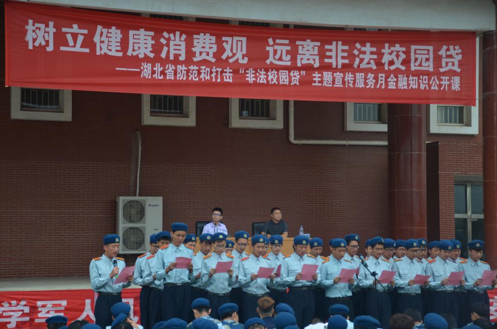 同学们观看了两部防范和打击“非法校园贷”典型案例警示教育片和两部由我校优秀辅导员杨利娟、刘佳主持的主题班会视频,向每位同学发放了一份《大学生金融服务宣传手册》,军训团一营一连(生物工程学院)30多名学生代表宣读了倡议书,金融专家姜骞老师讲授了“非法校园贷”的危害,介绍了银行校园金融服务产品,普及了金融知识。最后,余杰强调,全体同学要深刻认识“非法校园贷”的危害,要做到四点:一是树立健康消费观念。在生活上不羡慕、不攀比、不盲从,合理安排生活支出,做到量入为出,适度消费,拒绝过度消费、超前消费;二是采取正规解困办法。通过国家奖资助体系、学校奖助学金评审、勤工助学制度和银行、学校共同设立的金融网格化工作站等途径解决学习、生活上存在的经济困难;三是远离“非法校园贷”。全体学生要强化自我保护意识,提高风险意识;四是严格遵守校纪校规。全体同学要认真学习国家法律法规和学校规章制度,做遵规守纪的好学生。