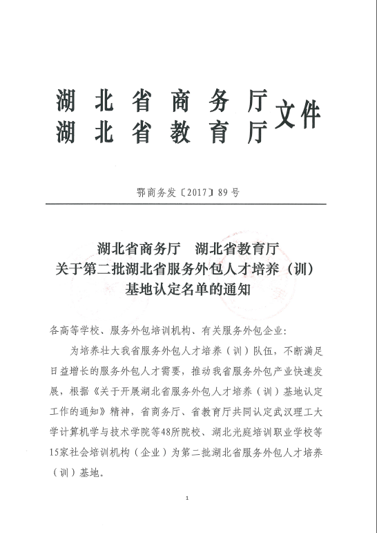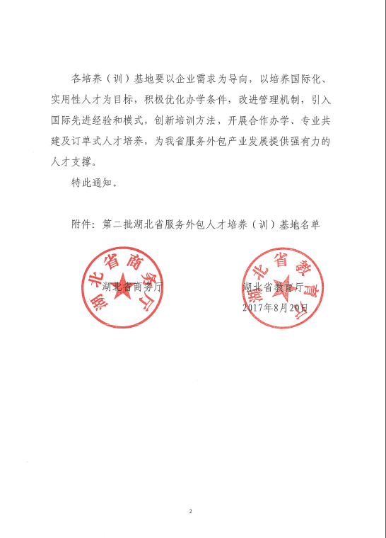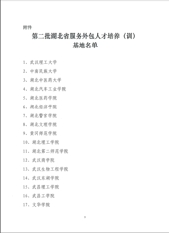 近日,湖北省商务厅、湖北省教育厅联合发文《关于第二批湖北省服务外包人才培养(训)基地认定名单的通知》,我校被认定为列入该省名单服务外包人才培养(训)基地。