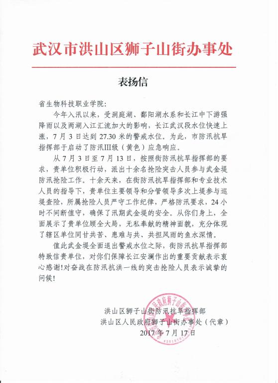 2017年7月17日,洪山区狮子山街防汛抗旱指挥部、洪山区人民政府狮子山街办事处发来表扬信,对我校在7月3日至7月13日防汛抢险工作中的表现给予充分肯定。