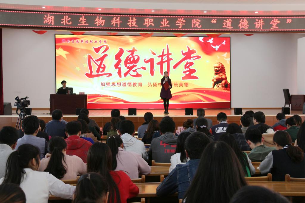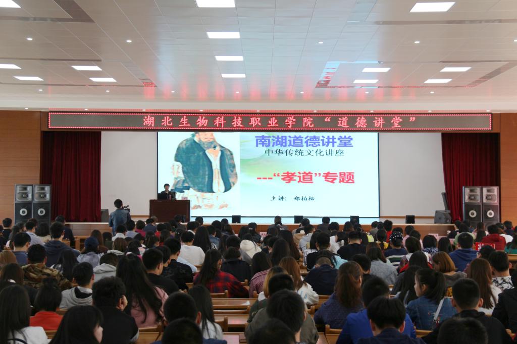 4月13日下午14:30,由湖北生物科技职业学院学工处、团委承办的“湖北生物科技职业学院道德讲堂——孝道专题”讲座在大学生活动中心举行。学校各部门代表、教师代表、学生工作团队全体成员以及学生代表共500余人参加了此次活动,活动由学工处李洁琳老师主持,黄冈职业技术学院郑柏松教授主讲。