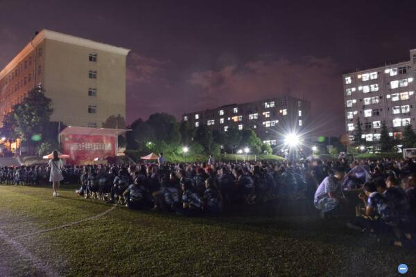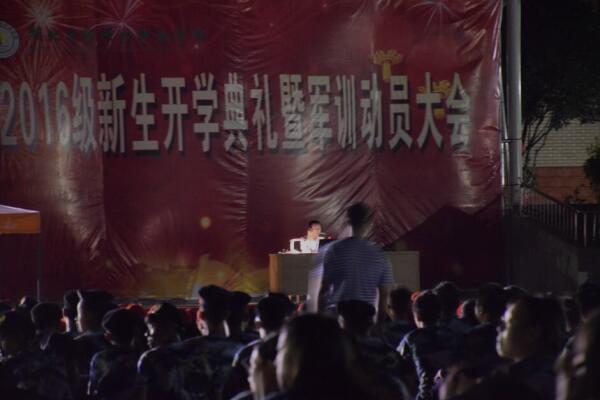 19点整,晚风和煦,2016级2600多名新生在教官的指令声中整齐地坐在操场上,王伟教授和军训团于震团长一身戎装来到现场,受到同学们的热烈欢迎。