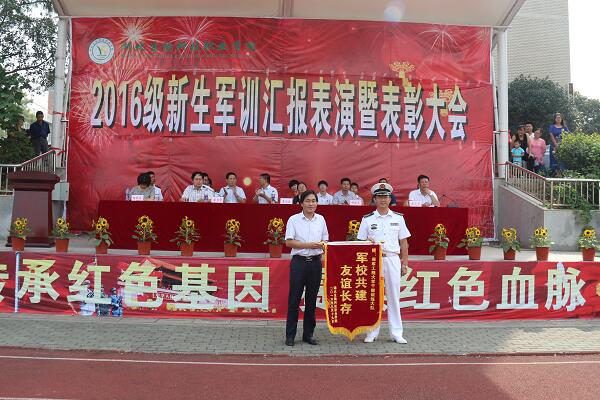 副校长杨艳芳宣读了《关于表彰2016年军训优秀连队和优秀学员的决定》,与会领导为获奖集体和个人颁发了荣誉证书。校长龚伏廷代表学校向海军工程大学干部训练大队赠送了题词为“军校共建 友谊长存”的锦旗。
