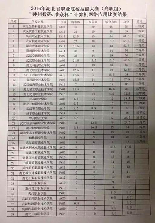 11月19日,2016年湖北省职业院校技能大赛高职组计算机网络应用赛项在武汉软件工程职业学院隆重举办。信息传媒学院组队参加本次比赛,斩获团体一等奖第一名的优异成绩,取得了近三年来该赛事的三连冠。获奖学生:马钦华、石柳、王正平;指导教师:胡骏、彭迪、邹君雨。