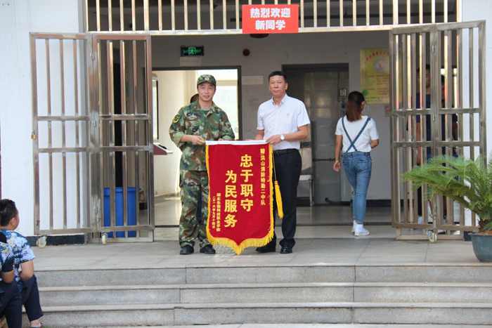 最后,我校副校长周元才为洪山消防特勤二中队赠送锦旗并表示感谢。