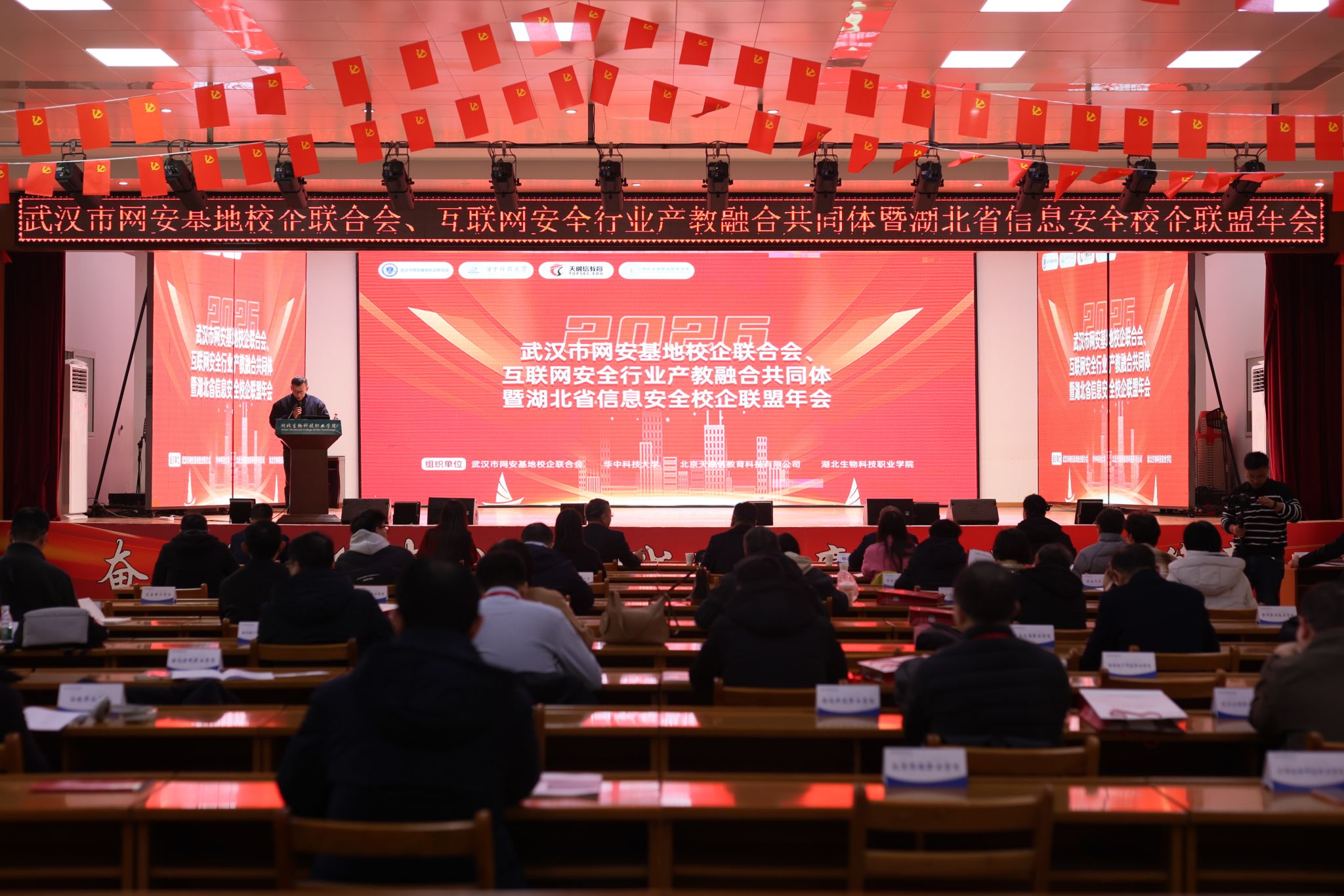 1月18日,恰逢学校承办湖北省职业院校技能大赛新一代信息技术赛道,以及区块链技术应用、网络建设与运维等多个重点赛项期间,武汉市网安基地校企联合会、互联网安全行业产教融合共同体暨湖北省信息安全校企联盟系列活动在学校同步开展。来自全省乃至全国的网络安全领域高校代表、行业企业精英、科研院所专家齐聚一堂,以赛事为纽带,以活动为载体,围绕人才培养、技术创新、校企合作、教材建设等核心议题深化交流,为网络安全行业高质量发展注入协同之力。