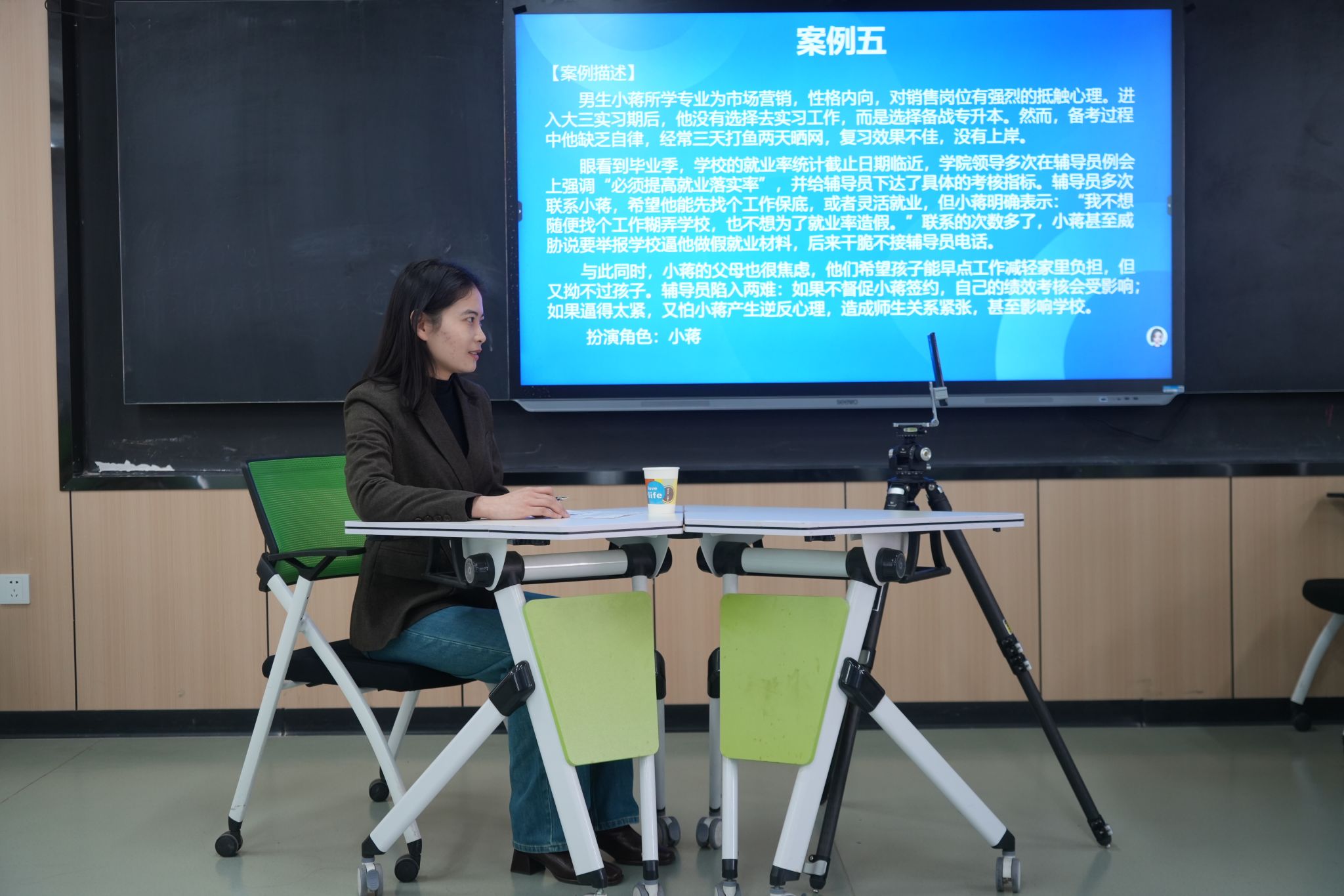 本次大赛设基础知识测试、案例研讨、谈心谈话三个环节。基础知识测试考察选手对党的创新理论、政策法规等理论的掌握,共有八名老师晋级决赛参加案例研讨、谈心谈话的比拼。案例研讨以“我提问、你回答”的方式展开,案例选用了辅导员工作中常见的心理健康、网络舆情、应急处突、学生矛盾化解、防电诈、学业辅导、资助育人、家校沟通等场景,主要考察辅导员综合运用理论分析问题、研判问题、解决问题、应急处突和临场应变的能力;谈心谈话通过情景再现,模拟辅导员与学生沟通场景,聚焦辅导员在价值引领、问题识别与分析、沟通技巧与共情能力、解决实际问题的能力和育人实效等,充分展现了辅导员忠诚为党育人的良好风貌与扎实专业素养。