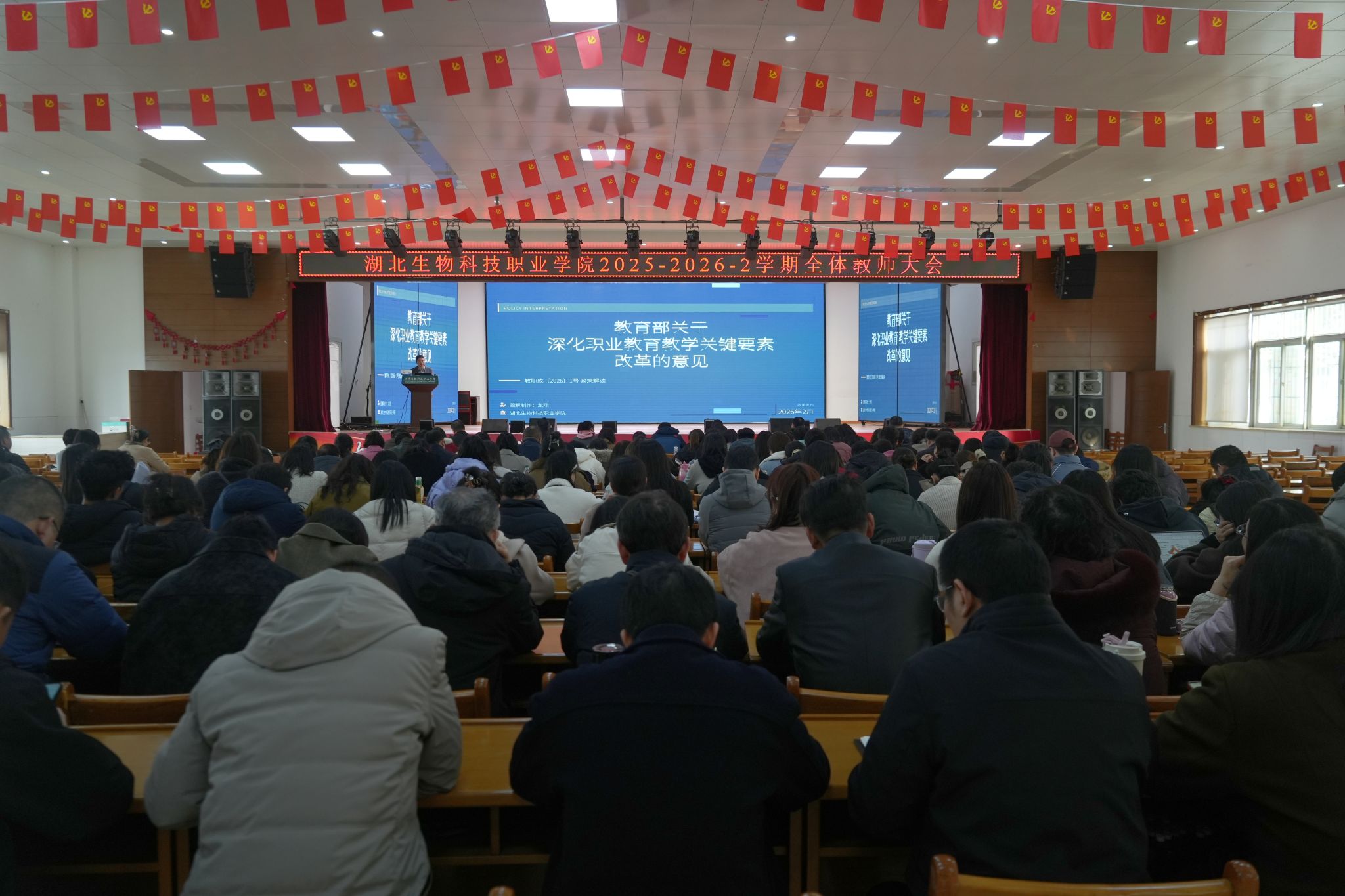 3月5日下午,学校在大学生活动中心召开了2025-2026学年第二学期全体教师大会。校党委委员、副校长龙翔作专题报告,全体教师参加会议。