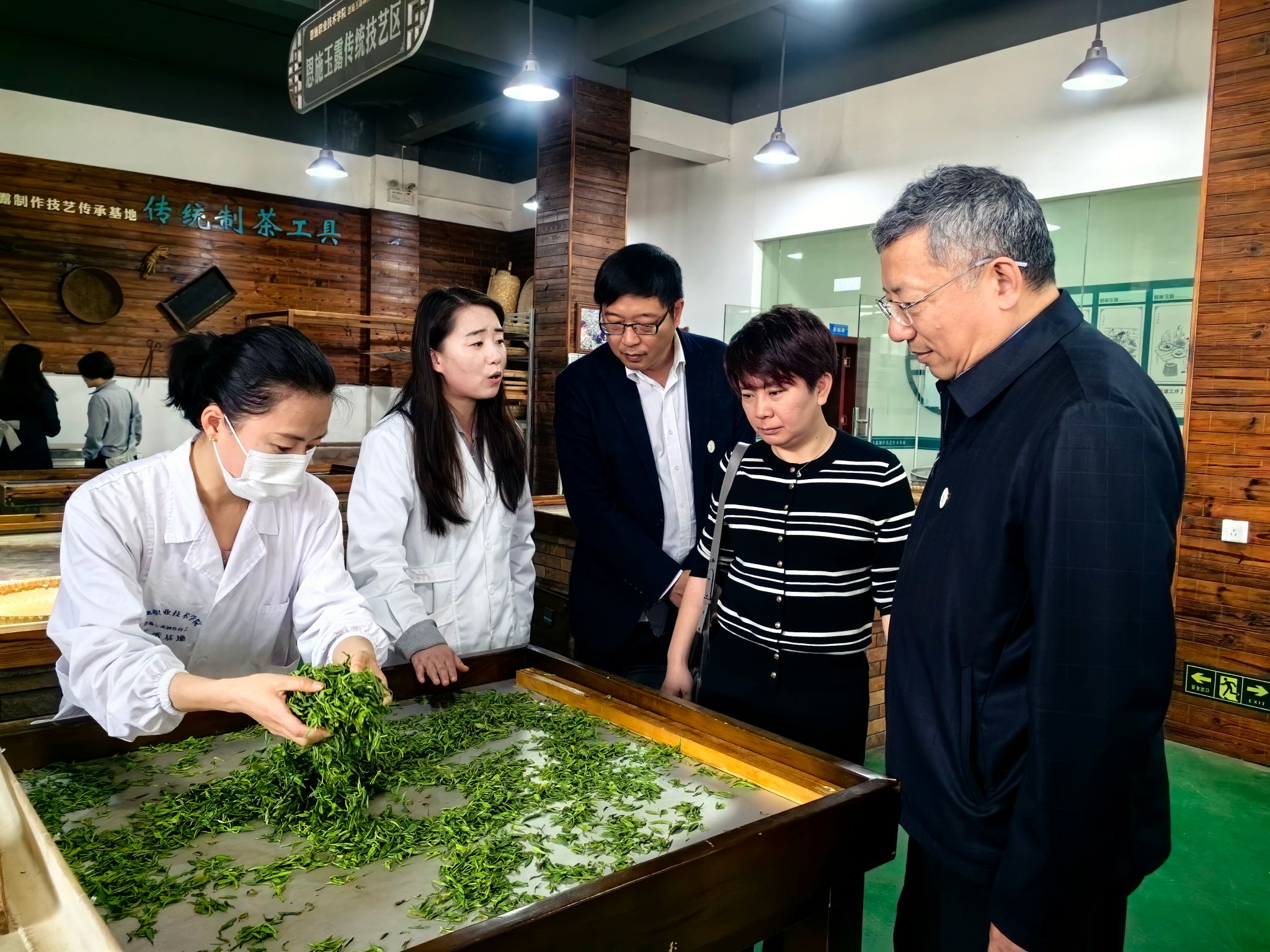 在恩施职业技术学院,李峰一行实地考察了无人机应用技术实训基地、非物质文化遗产传承基地、金丝楠产业学院及恩施玉露茶叶生产加工实训基地等特色教学场所,详细了解了该校在实训教学条件建设、产教融合等方面的先进做法,对其立足地方资源禀赋、服务区域产业发展的办学模式表示赞赏。