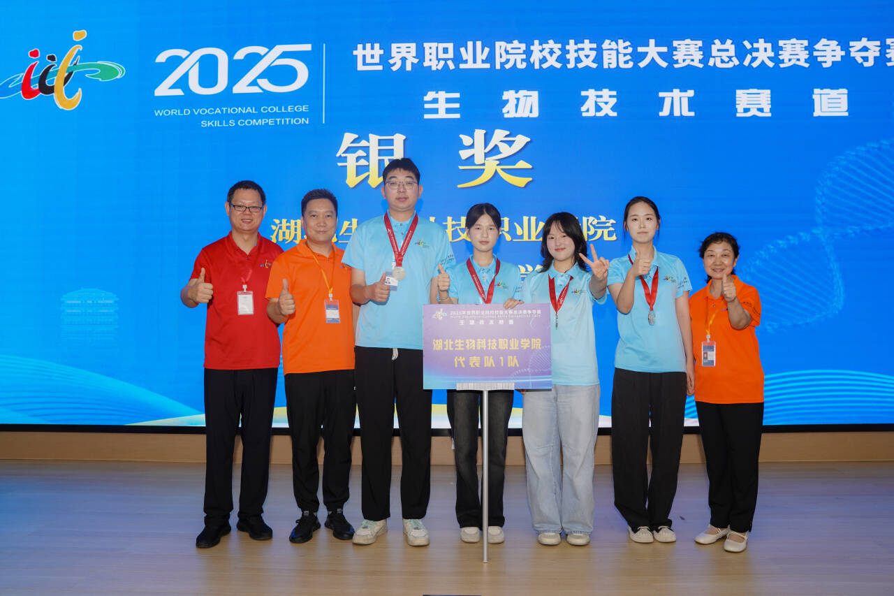 8月26日—29日,2025年世界职业院校技能大赛生物技术赛道(高职组)总决赛争夺赛在山东潍坊、淄博同时举行。来自全国31个省、自治区、直辖市的76支代表队、245名选手同台竞技。经过激烈的角逐,生物工程学院学生王烨雯、黄靖怡、杨励成、吴忧在艾炎军、周志娟两位教师指导下获得银奖。