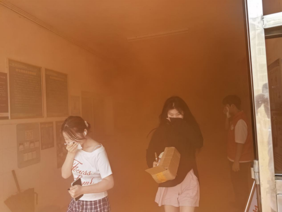 按照演练方案,中午12:30,所有疏散指引的老师和志愿者到达指定区域。为模拟更真实的火灾场景,消防教官准时拉响消防安全警报并在公寓内启用模拟火灾烟雾,顿时公寓楼道浓烟弥漫,警报大作,学生们严格遵循“弯腰低姿、捂住口鼻”的动作,以最快的速度从最近的安全通道有序疏散到西院足球场集合点名。整场演练从拉响警报,到最后一名学生疏散到足球场集合,共用时5分钟,达到了预期效果。