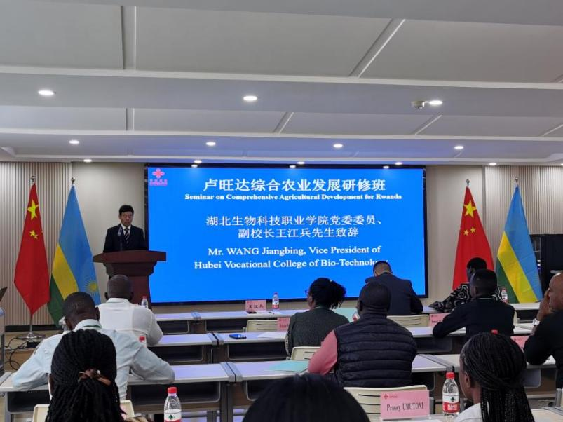 5月28日,由中国商务部主办、湖北生物科技职业学院承办的 “卢旺达综合农业发展研修班” 在学校北区正式开班。湖北省农业农村厅交流合作处二级调研员付向阳、湖北生物科技职业学院党委委员、副校长王江兵出席开班仪式并致辞,卢旺达大学农业、动物科学与兽医学院讲师纳尔西斯•穆林加代表参训学员发言。开班仪式由学校继续教育学院院长林红华主持。