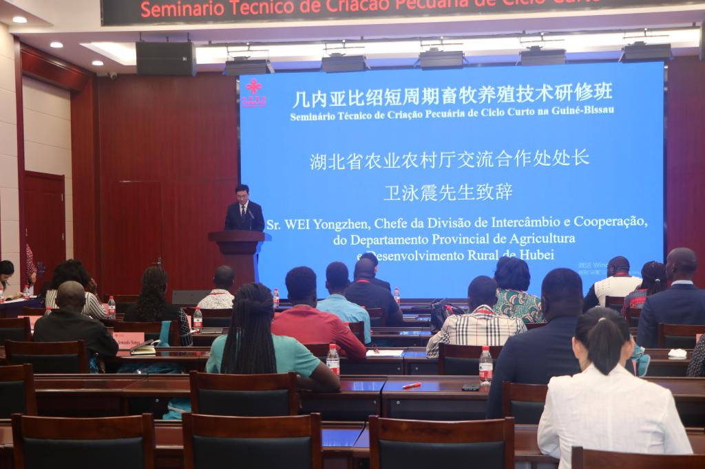 卫泳震在致辞中强调,农业是国家发展的基石,关乎着粮食安全和民生福祉。湖北作为中国的农业大省,在农业领域成就显著,具备诸多发展优势。此次“几内亚比绍短周期畜牧养殖技术研修班”意义非凡。我们期望通过此次研修,为几内亚比绍的学员们提供系统、实用的专业知识,助力大家提升畜牧养殖的专业技能,推动当地畜牧产业的发展。同时,也希望以此为契机,进一步加深两国在畜牧领域的交流,促进双方在技术、经验等方面的共享与合作。