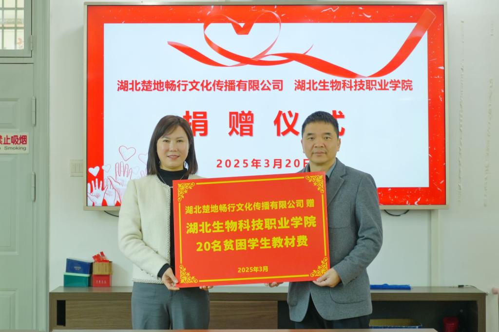 湖北楚地畅行文化传播有限公司为学校图书馆捐赠了价值二万元的图书,为学校教学比赛捐赠三千元鼓励金,为二十名贫困学生捐赠教材。