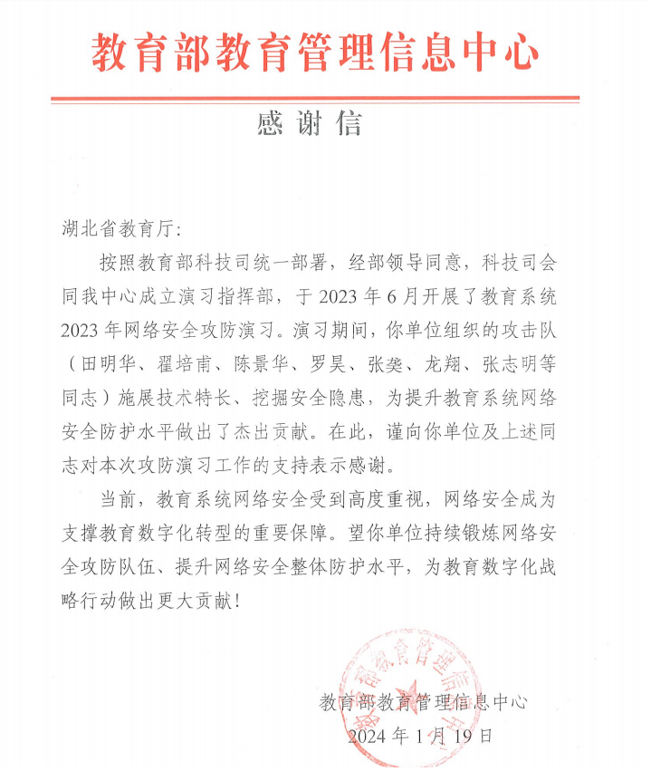 近日,教育部教育管理信息中心向湖北省教育厅致感谢信,为其对教育系统2023年网络安全攻防演习工作的支持表示感谢。