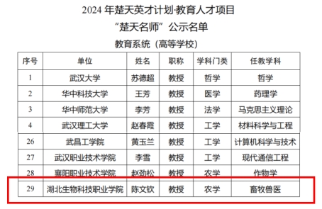 近日,省委人才办、省教育厅公布《关于印发2024年省“楚天英才计划·教育人才项目”楚天名师名单的通知》,动物(食品)科技学院院长陈文钦教授成功入选。