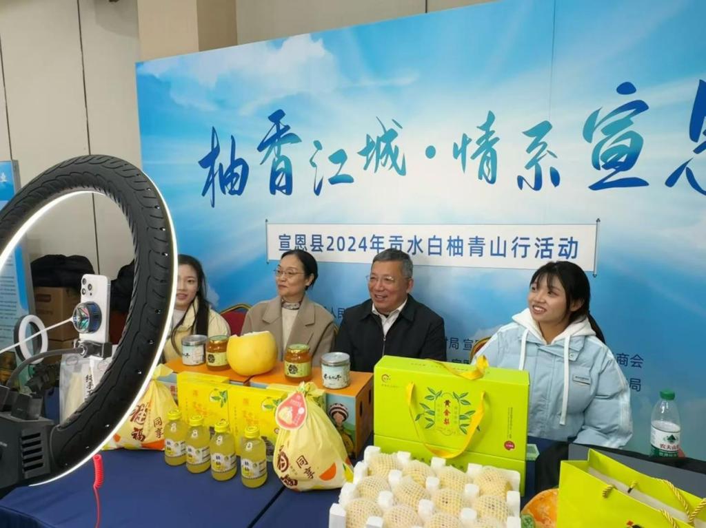 12月5日,“柚香江城·情系宣恩”宣恩县2024年贡水白柚青山行活动在武汉举行。校长李峰,校党委委员、党委宣传部部长、党政办公室主任王玲受邀出席本次活动。学校短视频直播协会师生在活动现场为恩施宣恩县贡水白柚等农副产品进行了现场直播推广。