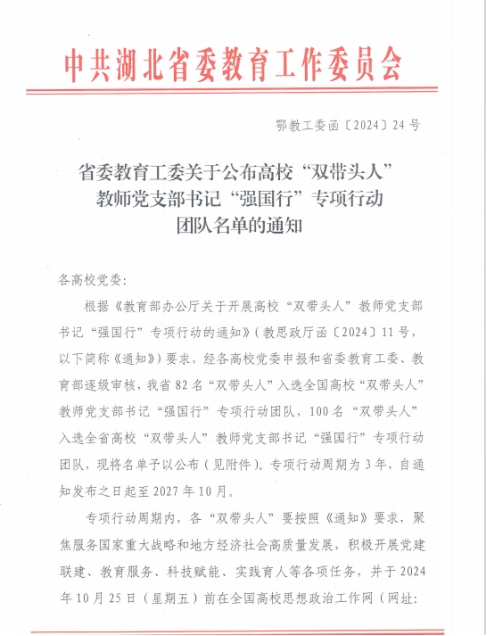 据悉,此次申报,经各高校党委申报和湖北省委教育工委、教育部逐级审核,我省仅有82名“双带头人入选”全国高校“双带头人”教师党支部书记“强国行”专项行动团队。下一步,支部将以“全国党建工作样板党支部”建设和全国高校“双带头人”教师党支部书记“强国行”专项行动团队为契机,从党建联建、教育服务、科技赋能、实践育人等方面加强支部建设,总结形成高质量的“强国行”专项行动典型工作案例,为全国高校党建提供支部特色经验。