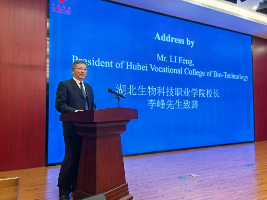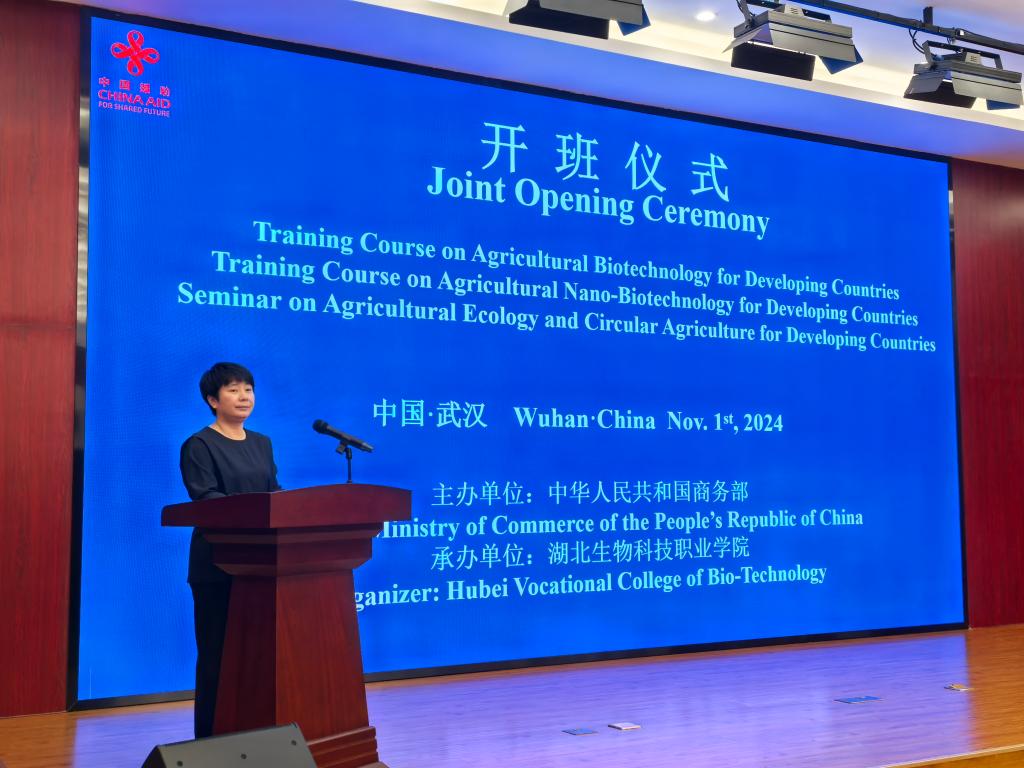 克艰绽华,终迎佳期。11月1日,由国家商务部主办、湖北生物科技职业学院承办的“发展中国家农业生态与循环农业官员研修班”“发展中国家农业生物技术培训班”“发展中国家农业纳米生物技术培训班”在学校北校区报告厅同时开班。省农业农村厅交流合作处处长杨可俊,学校校长李峰出席开班仪式并致辞,校党委副书记、纪委书记潘彦主持。