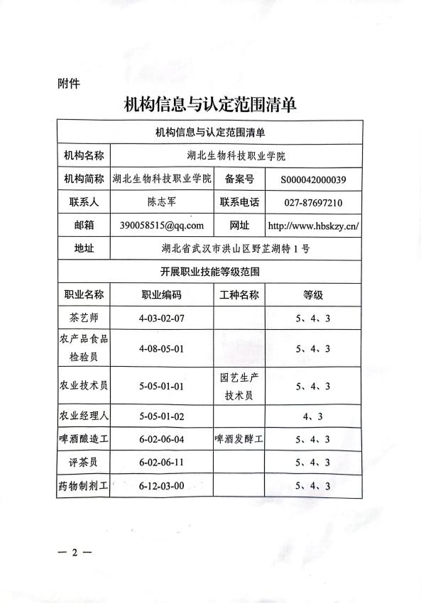 湖北生物科技职业学院是经湖北省人民政府批准、国家教育部备案的全日制公办普通高等职业院校,是湖北省唯一一所农业类高职院校。2022年经湖北省人力资源和社会保障厅审核评估,批准为湖北省职业技能等级认定社会培训评价组织之一,评价机构备案号为:S000042000039,在批准认定的职业(工种)范围内为符合条件的社会人员开展培训与评价工作。