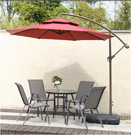 三套1桌4椅圆桌D80cm编藤桌椅, 均带遮阳伞; 一套1桌6椅带遮阳伞。铁艺150*80cm |