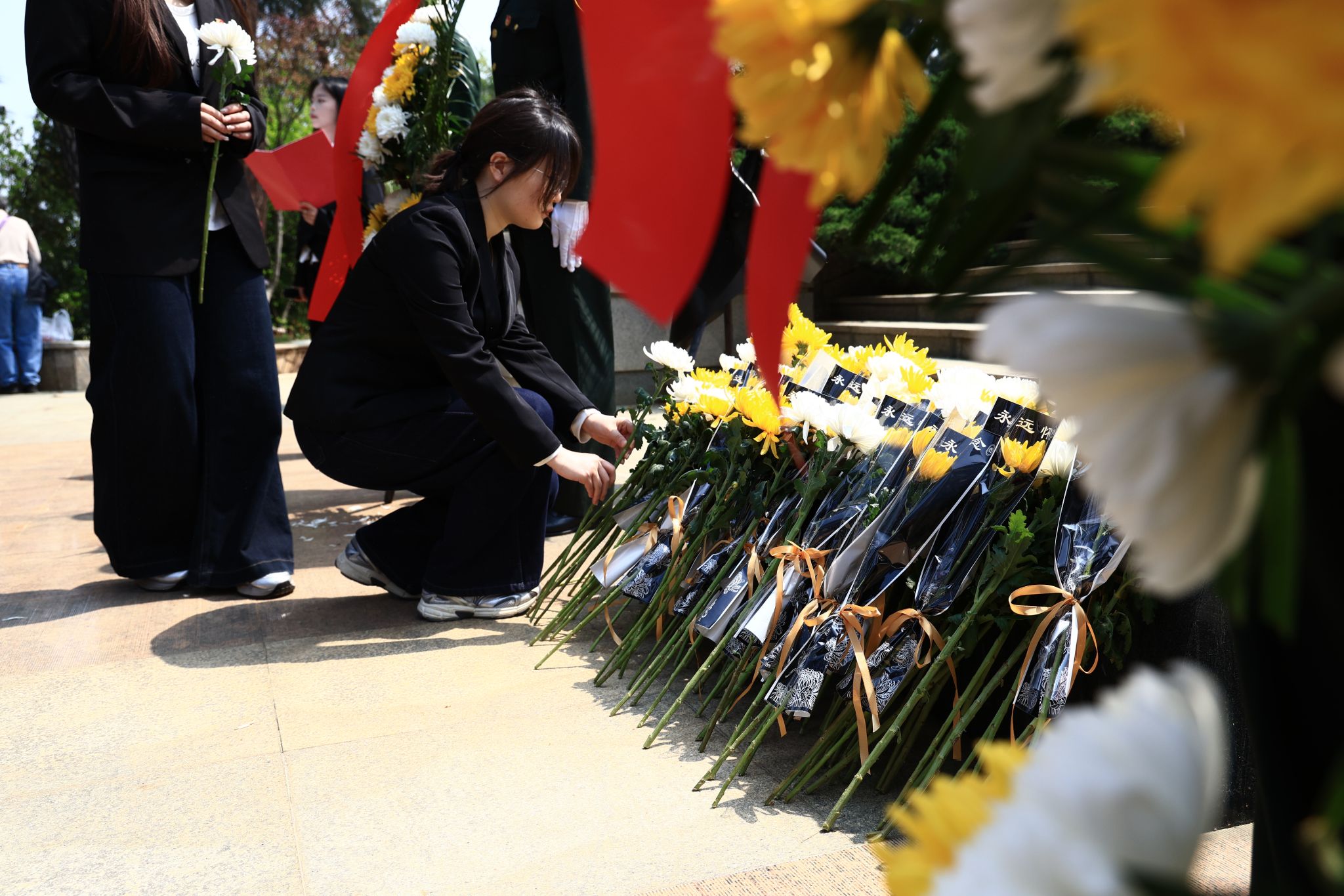 离开博物馆师生们来到武汉抗战纪念园举行祭扫仪式。在纪念碑前,师生集体肃立默哀。国旗护卫队队员敬献花篮。现场老师讲述了革命先烈为国家独立与民族解放作出的牺牲与贡献,勉励新时代青年铭记历史、传承红色基因,将爱国情怀与奋斗精神融入学习和工作中。仪式最后,师生依次敬献鲜花、擦拭烈士纪念碑,并在纪念碑前合影留念。