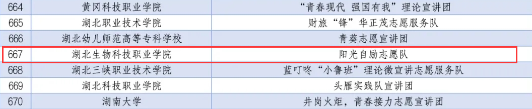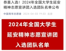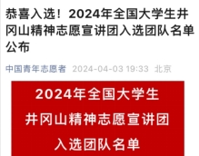 日前,团中央青年志愿者行动指导中心联合各相关单位开展遴选大学生志愿宣讲团进行2024年全国大学生井冈山精神志愿宣讲活动、延安精神志愿宣讲活动和“两弹一星”精神志愿宣讲活动的结果公布。经过层层遴选,学校动物(食品)科技学院“阳光自励团”志愿宣讲团成功入选上述三项志愿宣讲团。