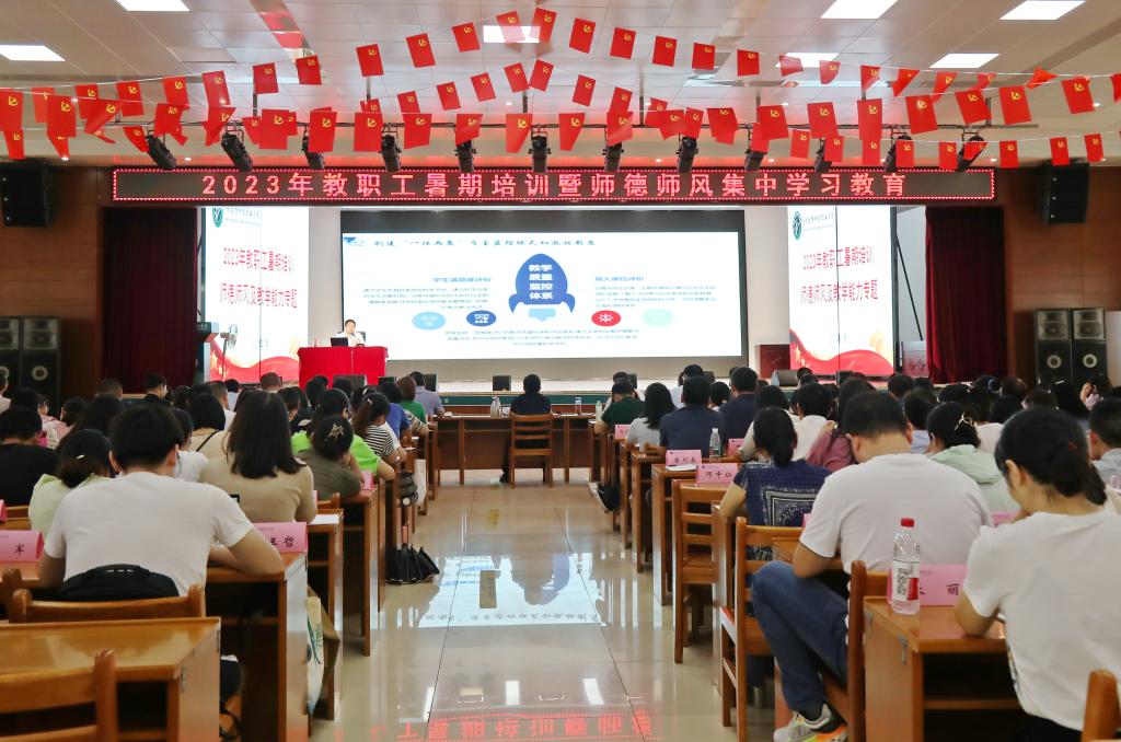 根据学校2023年暑期培训安排,7月14日上午,校党委委员、副校长龙翔就师德师风及教育教学规划进行了专题培训。全体校领导、各部门主要负责人出席会议,全体专兼职教师参加会议。会议由教务处处长张艳主持。