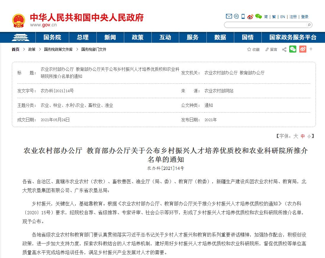 5月24日,农业农村部办公厅、教育部办公厅公布了乡村振兴人才培养优质校和农业科研院所推介名单,我校在经院校自荐、省级推荐、专家评审、社会公示等环节后,成功入选最终名单,正式被推介为乡村振兴人才培养优质校。