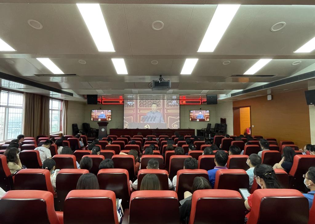 教职工在一号教学楼601报告厅观看大会直播